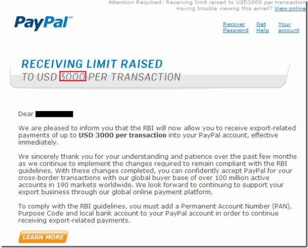 PayPal India Limits Raised TO USD 3000 Per Transaction