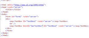 Now let’s go back to MyThemedPage.aspx and use this style. Now as we have applied the Theme1 to the MyThemedPage.aspx the textboxes there will automatically pickup the style of the textbox which has no SkinID. If we want to use a style that has a skinid then you would need to add that skinid to the control we want to apply the style to. So the textbox1 will have the cssclass foo applied to it will be foo and textbox2 will have the cssclass bar applied to it.