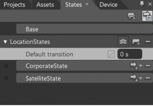- Now let's go to the top left of expression blend where we have states and lets create new state group. Click on the **Add State Group** button and name the state group as **LocationStates**. Now add two new states namely **CorporateState** and **SatalliteState**. Now your state group should look something loke the screenshot below: